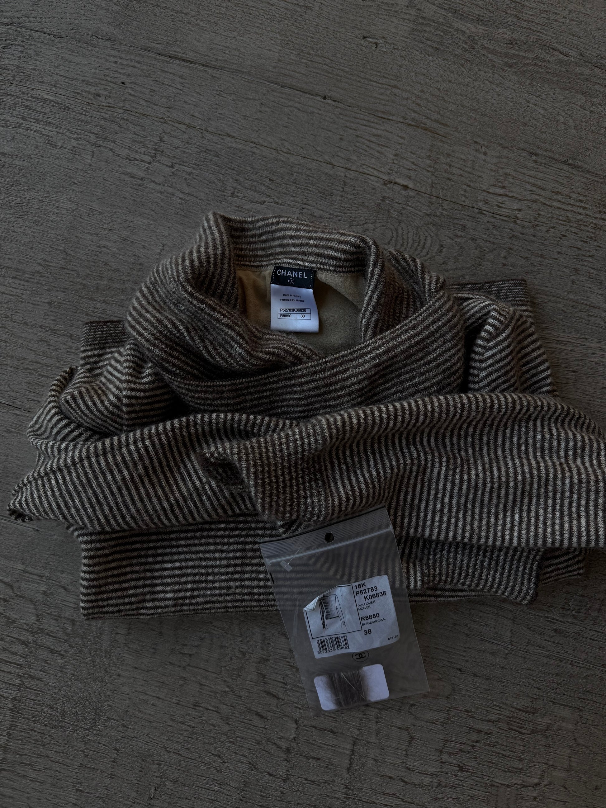 Vintage 2015 Chanel by Karl Lagerfeld Striped Mohair 'CC' Turtleneck. From the Fall 2015 Runway Collection. It is a gorgeous brown striped mohair sweater, fully lined in silk. It has a draped rolled turtleneck & ribbed knit trim, featuring an enamel waistline 'CC' charm. Its material are as follows: