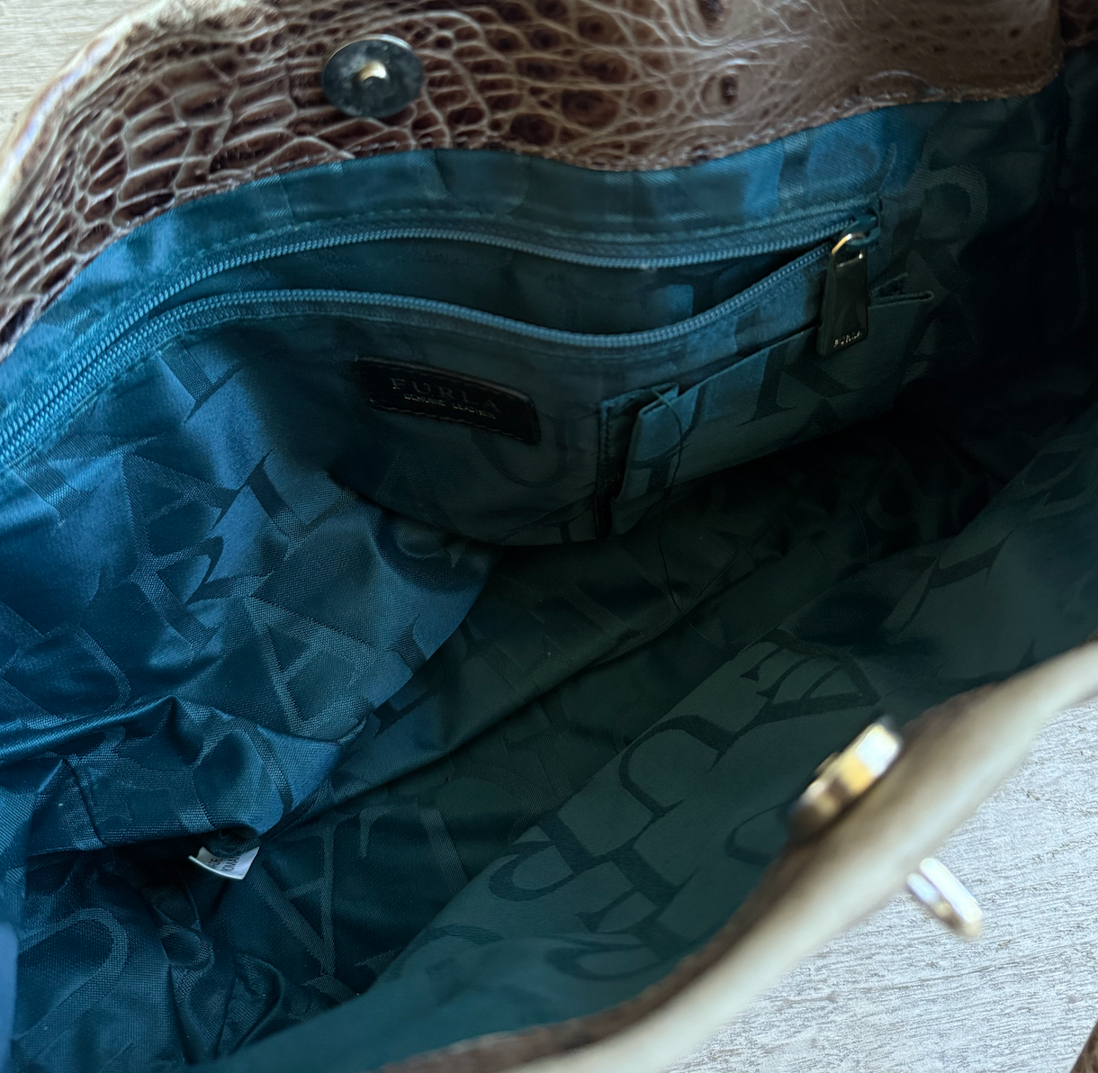 Vintage Furla Crocodile print tote bag. In great condition and has protective feet at the base, snap closure at the top and a single pocket on the inside. Please see photos for more detals.